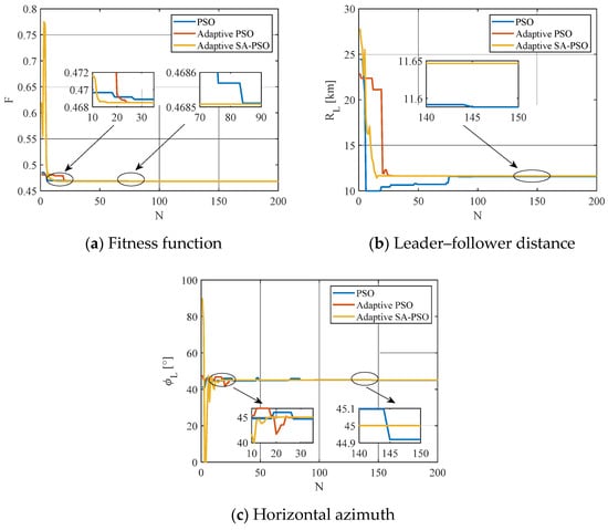 Figure 6b shows that after 26 iterations of the adaptive SA-PSO algorithm, the distance between the leader and follower missiles converges to an optimal value of 11.65 km. In comparison, the distance between the leader and follower missiles gradually converges to optimal values of 11.64 km and 11.59 km after 37 and 146 iterations of the adaptive and traditional PSO algorithms, respectively. Similarly, Figure 6c shows that after only 19 iterations of the adaptive SA-PSO algorithm, the azimuth angle between the leader and follower missiles converges to an optimal value of 45.03°. In comparison, with the PSO algorithm, the azimuth angle between the leader and follower missiles gradually converges to the optimal value after 145 iterations, whereas the azimuth angle converges after 33 iterations of the adaptive PSO algorithm. Thus, a comprehensive analysis reveals that the performance of the adaptive SA-PSO algorithm is better than that of the traditional and adaptive PSO algorithms. Since the traditional PSO algorithm does not include any improvements, it shows the weakest optimization performance.