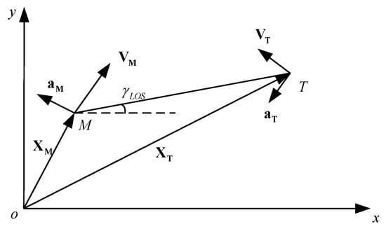 As shown in Figure 1, a general engagement geometry is presented where a missile M is attempting to attack a maneuvering target . In the frame, denotes the position vector of the missile, denotes the velocity vector of the missile, denotes the LOS angle, denotes the missile’s acceleration vector, denotes the position vector of the target, denotes the velocity vector of the target, is the time-varying maneuvering acceleration of the target.