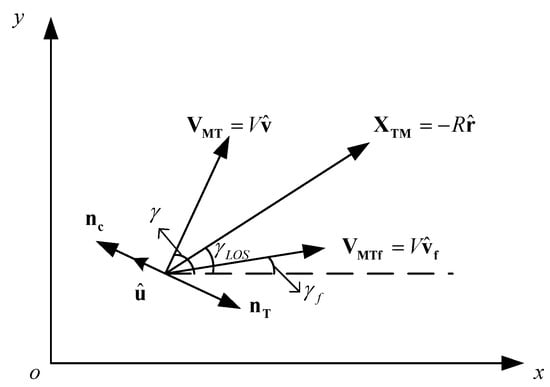 For a vehicle with no longitudinal control capability, the guidance command can be rewritten as the scalar-form expression perpendicular to the velocity vector. We defineas the component of the vehicle’s commanded acceleration vector perpendicular to,as the unit vectors co-directional with. Let, the scalar-form expression ofcan be obtained as: