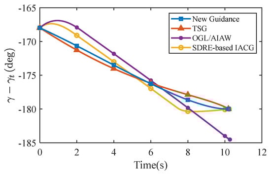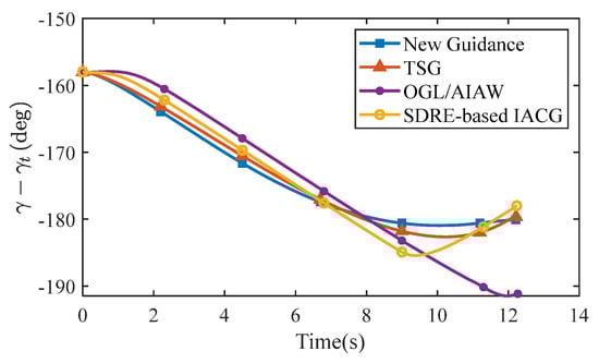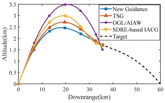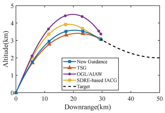 Comparison of the trajectories for new guidance, TSG, OGL/AIAW, and SDRE-based IACG when .