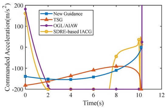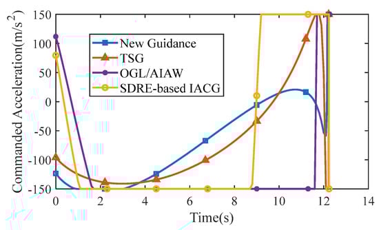 Comparison of the commanded acceleration profiles for new guidance, TSG, OGL/AIAW, and SDRE-based IACG when .