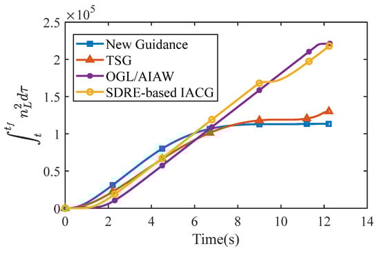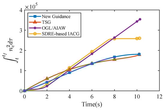 The simulation results of the four guidance laws mentioned above are shown in Figure 17, Figure 18, Figure 19, Figure 20 and Figure 21 and Table 6. Figure 17 shows that the OGL/AIAW and SDRE-based IACG fails to intercept the target, thus the impact angle constraints also cannot be satisfied (shown in Figure 18). Figure 20 indicates the main reason for the failures of OGL/AIAW and SDRE-based IACG is that when the acceleration limit is stricter, their acceleration command is saturated. Also, we can see from Figure 20 that even if the guidance command of TSG is not saturated, it still causes larger miss distance than the new guidance (shown in Table 6). Figure 19 shows the commanded acceleration of the new guidance changes slowly compared with other guidance laws, so the actual acceleration tracks well and the miss distance is small (shown in Table 6). This also verifies that a smaller commanded acceleration leads to smaller miss distance. Figure 21 shows the cumulative control effort profiles for the four guidance laws, from which we can see that the control effort of the new guidance is smaller than that of other three guidance laws for this case. Therefore, imposing constraints on terminal maneuvering acceleration leads to good performance in the face of time delay. Otherwise, the guidance command may diverge when facing a maneuvering target and leads to low guidance accuracy.