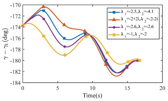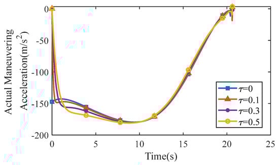 The simulation results under different values of are shown in Figure 14, Figure 15 and Figure 16 and Table 5. Figure 14 shows the trajectories under different values of . Figure 15 indicates the time delays, and it can be seen that all load factors finally converge to near zero. Figure 16 shows that the impact angle constraints can be achieved. Table 5 shows that without any compensation incorporated for the delays, the new guidance still has strong robustness and high precision against time delays.