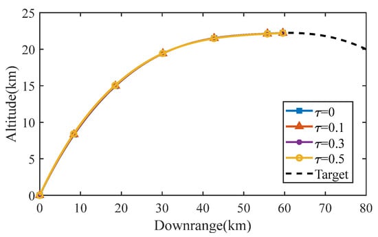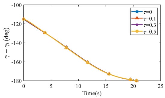 Now we present four cases with different time delays, which are , , and respectively. The initial conditions of intercepting vehicle are set to , , and . The change rate of the vehicles’ velocity is . The limitation of the vehicle’s maneuverability is . The initial conditions of target are , , and . Let , where = {17.51, −3.77, 0.64, −0.04, 7.57 × 10−4}. The desired final flight-path angle of the vehicle is set to .