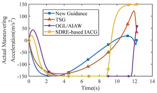 Comparison of the actual acceleration profiles for new guidance, TSG, OGL/AIAW, and SDRE-based IACG when .