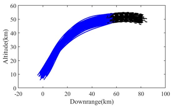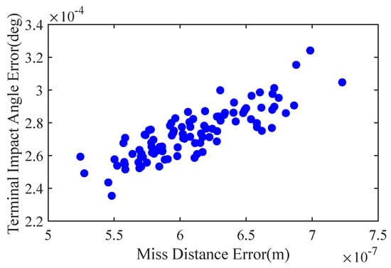 In this case, 100-run Monte Carlo simulations are carried out to demonstrate the robustness of the new guidance. The initial conditions of intercepting vehicle are set to , , and . The change rates of the vehicles’ velocities are determined by aerodynamic drag. The limitation of the vehicle’s maneuverability is set as . The initial conditions of target are , , and . The maneuvering accelerations of the targets are specified by , where its parameters = {18.76, −4.04, 0.69, −0.04, 8.11 × 10−4}. The desired final flight-path angle of the vehicle is set to . The uncertainties of the initial states of vehicle and target, the aerodynamic coefficients, the atmospheric density, and target maneuver parameters are supposed to follow Gaussian distributions. The amplitude of each uncertainty is given in Table 7.