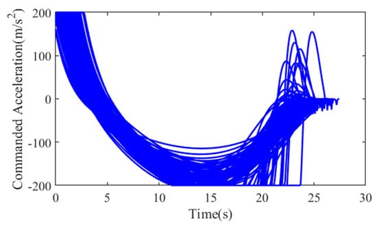 The simulation results are shown in Table 4 and Figure 10, Figure 11, Figure 12 and Figure 13. In Case 1–3, as the selected guidance coefficients fall within the stability domain, the vehicles can successfully intercept the targets while satisfying all the constraints. However, in Case 4, the guidance coefficients are located at the boundary of the stability domain but do not belong to the stability domain. Due to this, the commanded acceleration for Case 4 fails to converge to zero finally, as shown in Figure 11. This indicates that the analysis taken on the stability domain is rigorous.
