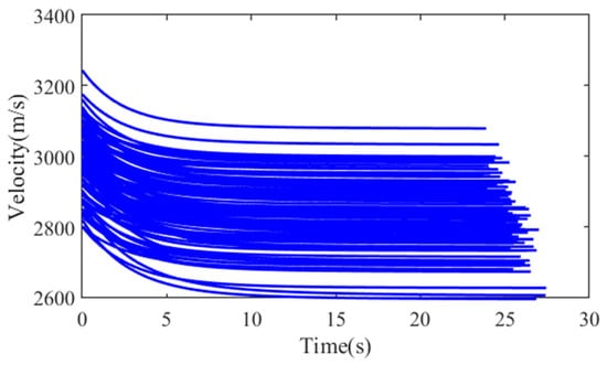 Figure 22, Figure 23, Figure 24, Figure 25, Figure 26 and Figure 27 show the simulation results in dispersed cases. Figure 22 displays the trajectories in dispersed cases, where the blue lines denote the trajectories of vehicles and the black dash lines denote that of the targets. Figure 23 and Figure 27 show the commanded acceleration profiles can converge to zero finally in dispersed cases. Figure 24 and Figure 26 show sufficiently small miss distance and impact angle errors, which indicates that the guidance with the impact position and impact angle constraints can be achieved. Figure 25 shows the velocity profiles in dispersed cases.