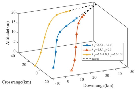 Here 3D examples are given. The initial conditions are shown in Table 8. The change rates of the vehicles’ velocities are governed by aerodynamic drag. The limitation of the vehicle’s maneuverability is . The maneuvering accelerations of the targets are specified by , where = {2.44, 1.28 × 10−3, 2.24 × 10−2, −8.00 × 10−4, 2.40 × 10−4, −1.78 × 10−5}. The desired velocity vectors of the vehicles are set to and , which means head-on collision. The guidance coefficients are selected within the stability domain shown in Equation (123), as shown in Table 8.