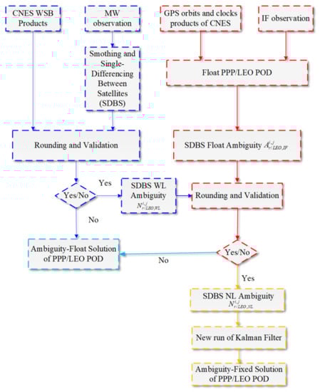 It is worth mentioning that the dynamic models of real-time RPOD, such as the atmospheric density model and N-body perturbation, simplified in our work are compared with traditional post-processing RPOD for LEO [46]. Moreover, some dynamic models, like ocean tide perturbation, earth radiation pressure, and relativistic effects that cause less effect on acceleration, are neglected [14,46]. The purpose is to reduce computing resources and improve algorithm running efficiency as much as possible without reducing the performance of real-time LEO RPOD, so as to adapt to future spaceborne observation conditions. Finally, the flow diagram shown in Figure 1 displays the process of ambiguity resolution for real-time PPP and onboard LEO POD.