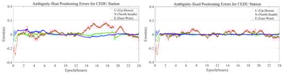 The time series of CEDU station position errors between the ambiguity-float (left subgraph) or ambiguity-fixed (right subgraph) solution and IGS-released data.