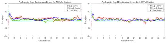 The time series of NOVM station position errors between the ambiguity-float (left subgraph) or ambiguity-fixed (right subgraph) solution and IGS-released data.
