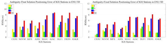 IGS station average positioning error of ambiguity-float (left) and ambiguity-fixed (right) solutions in E, N, and U directions and 3D-RMS.