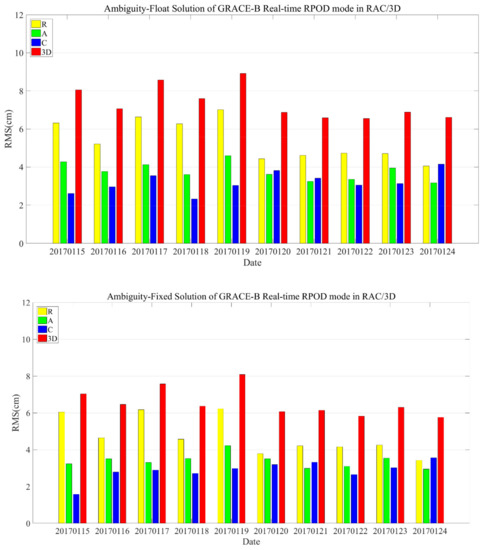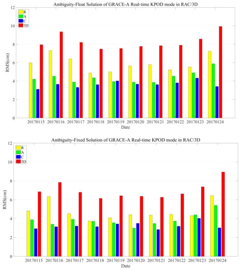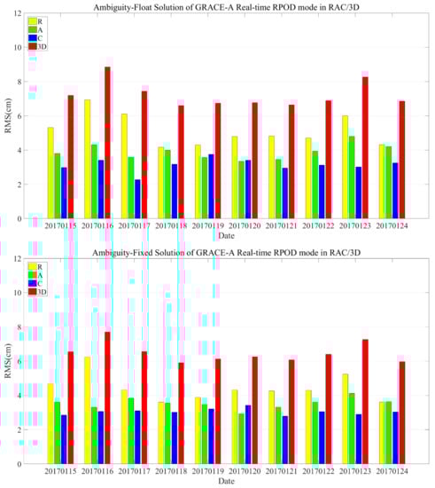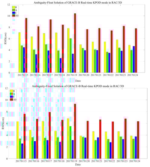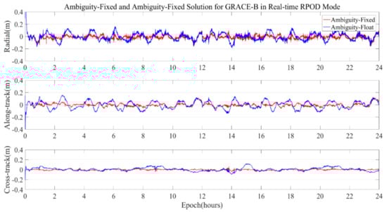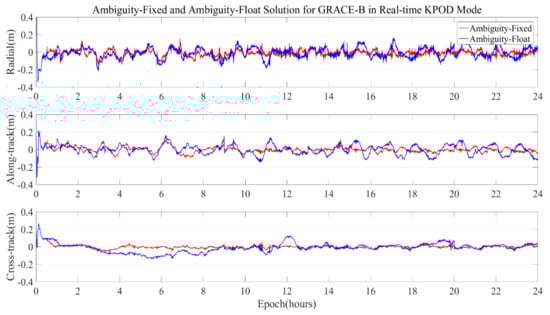 In this section, the spaceborne data of GRACE series satellites are used to verify the performance of real-time LEO KPOD with ambiguity resolution and compare with float KPOD for GRACE satellites. Ten days of onboard observations from 15 January 2017 to 24 January 2017 were used in this experiment. Figure 5 displays the time series of orbit differences between the real-time KPOD for GRACE-B and reference orbits on 15 January 2017, where the differences are shown in radial (R), along-track (A), and cross-track (C) directions, respectively. Reference orbits as real values are calculated by post-processed RPOD from the JPL (Jet Propulsion Laboratory), which can be obtained from the Information System and Data Centre (ISDC). Additionally, the orbital time series of differences with ambiguity-fixed and ambiguity-float solutions are denoted by red lines and blue lines, respectively. It can be found in Figure 5 that orbital differences of real-time KPOD with ambiguity resolution are better than those of the float KPOD mode in R, A, and C directions after ambiguities are recovered as integers. Meanwhile, compared with the real-time KOPD with ambiguity-float solutions, the differences of orbit in ambiguity-fixed solutions perform smaller fluctuations.