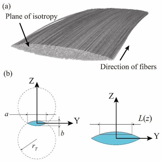 The lenticular-shaped cross-section of the fiber tows and the corresponding geometric parameters: (a) experimental CT image of the fiber tow [29]; (b) geometric parameters of the lenticular-shaped cross-section.