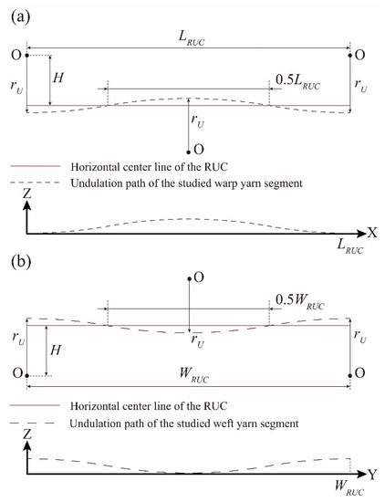 The undulation path of the studied warp yarn segment is presented in Figure 3a. rU represents the radius of the arcs and LRUC represents the length of the mesoscale RUC. H stands for the distance between the horizontal center line of the RUC and the center of the arcs in the undulation path: