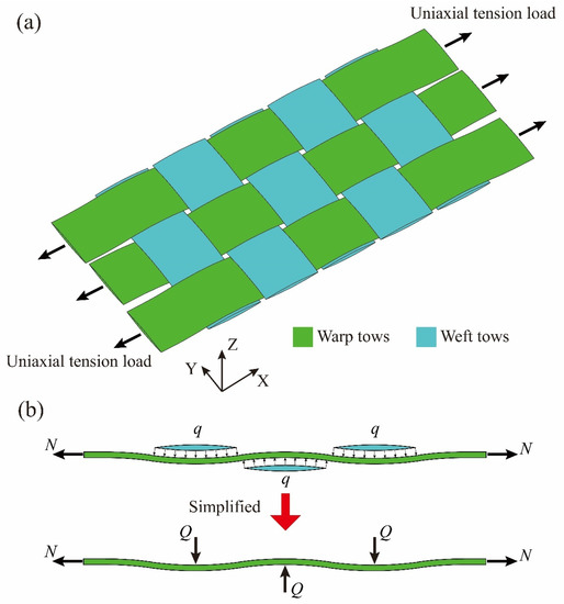 The monolayer of the plain-woven fabric composites under the uniaxial tension load along the warp direction is presented in Figure 4a. As the warp yarns are straightened the distributed interaction force of q between the weft and warp yarns exists in hindering the straightening of the warp yarns and causing the crimping of the weft yarns. For the convenience of the following analyses the distributed interaction force of q is simplified as the concentrate force of Q, as illustrated in Figure 4b.