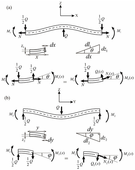 In Figure 5a the axial load of N and the constraint moment of M1 are loaded at the boundary cross-sections of the warp yarn segment. The interaction loads of Q and ½Q from the weft yarns concentrate at the middle location and the left and right endpoints, respectively. dl1 stands for the differential length of the warp yarn segment and θ stands for the angle between dl1 and the X-axis. At the x-corresponded cross-section in the warp yarn segment the horizontal internal load of N and the vertical internal load of ½Q, which satisfy the force balance condition, are further converted into the internal tensile load N1(x) and the internal shearing load Q1(x), which are perpendicular and parallel to the cross-section, respectively.
