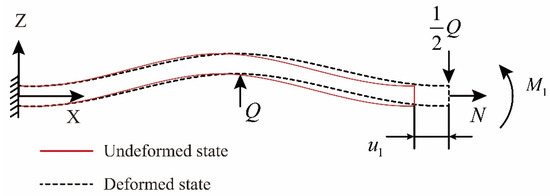 Constraint at the left end, the right end’s displacement of the deformed warp yarn segment along the X-axis corresponding to the axial tensile load of N is presented as u1 in Figure 6.