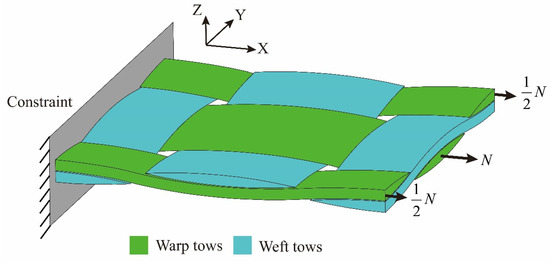 The part composed of fiber tows in the mesoscale RUC is isolated and studied in Figure 7. With the left-end constraint the displacement of the loading end reaches u1 under the total axial tension of 2N loaded at the cross-sections of the warp yarns with the area of 2A, corresponding to the result of the single warp yarn segment in Figure 6.