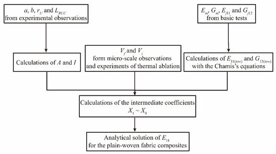 With the above inputs the intermediate coefficients of X1–X9 are calculated according to the flowchart illustrated in Figure 8, and the result of E11 for the T300/Cycom970 plain-woven fabric composite is predicted as 54.39 MPa.