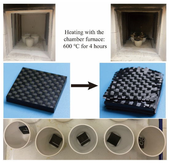Thermal ablation experiments have been conducted on the specimens under the ASTM Standard D3171 [32]-based procedure in order to separate the component of the fiber from the matrix and obtain the total fiber volume fraction of VfT. The specimens are first weighed with an electronic balance and the initial weight of m0 for each specimen is achieved. After heating with a chamber furnace under a temperature of 600 °C for four hours, as shown in Figure 10, the epoxy matrix component in the specimens is totally ablated and the residual weight of fibers, mf, for each specimen is recorded. For each of the specimens, with the densities of the matrix (ρm) and the carbon fiber (ρf) presented in Table 1, the total fiber volume fraction, VfT, of the plain-woven fabric composite could be obtained as: