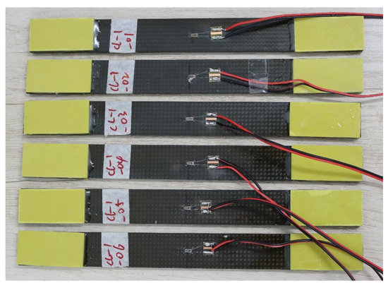 Considering the purpose of validation, the manufacturing process of the composite laminates has been intentionally controlled to enhance the specimens’ consistency and reduce the effects of uncertainty. The specimens with a stacking sequence of [0]16 and dimensions of 250 mm × 25 mm × 3.456 mm are shown in Figure 12, which are tested by an electronic universal testing machine with a maximum loading capacity of 100 kN. Six specimens numbered CL-1-01 to CL-1-06 have been tested under the ASTM Standard D3039M-17 [33]-based procedure. Subjected to tensile loading, the stress–strain curves of the specimens have been achieved, with longitudinal strain results obtained from the strain gages. For two different points on the stress–strain curve, the difference in the applied tensile stress is defined as Δσ and the difference between the strains is defined as Δε. Stress–strain data within the lower half of the stress–strain curves are utilized ito calculate the uniaxial tensile modulus of E11: