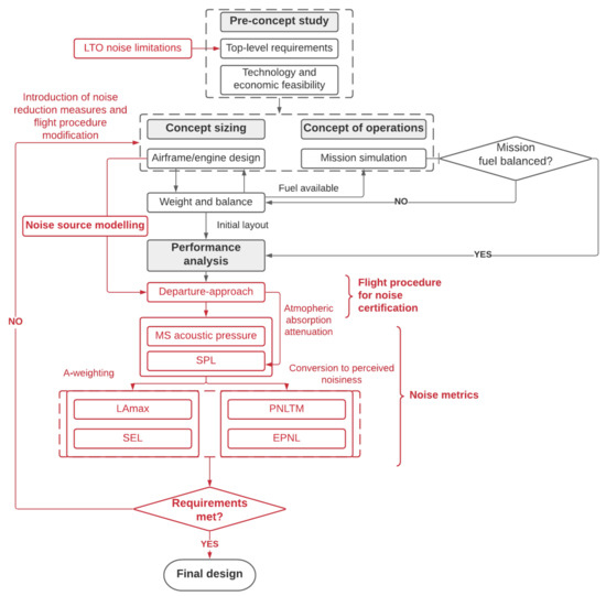 The determination of noise levels received on the ground is a complex multidisciplinary problem that must be simplified to be included at a conceptual design level. Figure 2 suggests a possible way to embed aircraft noise prediction into the traditional conceptual design process framework. In detail, in Figure 2, aircraft noise prediction analyses are added to enrich the original activity flow as reported in textbooks [33,34] and are marked in red.