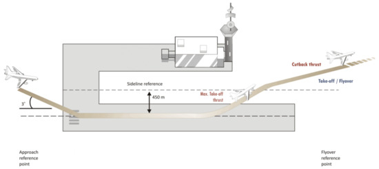 - ICAO. Environmental Protection. In Annex 16 to the Convention on International Civil Aviation, 8th ed.; Vol. I: Aircraft Noise, Appendix 1; ICAO: Montreal, QC, Canada, 2017. [Google Scholar]