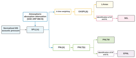 The procedure used to predict the overall aircraft noise level is illustrated in Equation (1), where the is the dimensionless mean-square acoustic pressure, referred to as , with as the ambient density and as the ambient speed of sound.