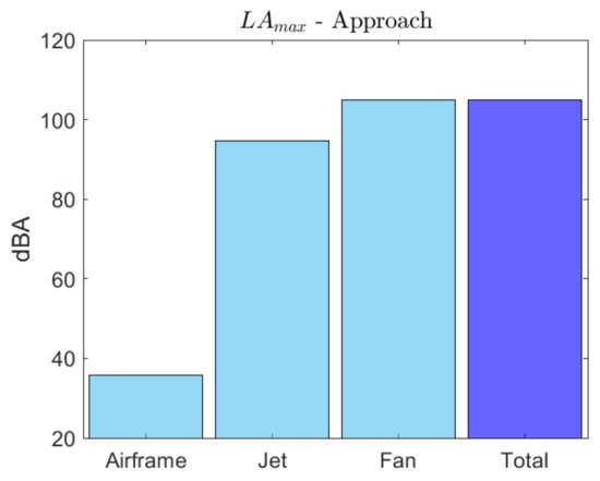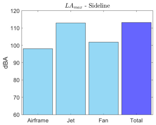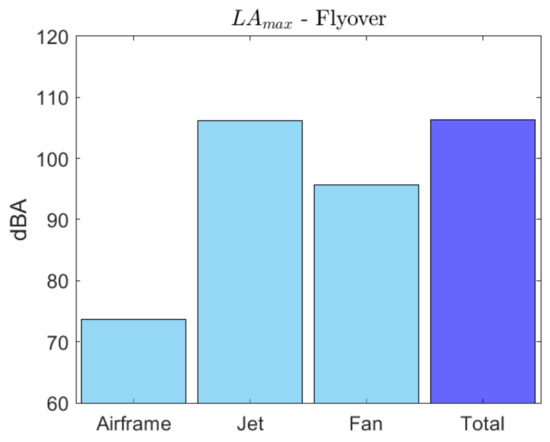 Similar to the strategy adopted for airframe noise prediction, the contributions of engine noise can be further decomposed into several noise sources. Noise generated by the engine consists of several contributions, which in the literature are classified into fan noise, jet noise and engine core noise (compressor stages, combustor, turbine stages) [49]. However, considering the limited amount of data available during the early design phases, the engine noise model described in this paper considers only the two most predominant engine noise sources—fan and jet noise. This hypothesis is a well-established practice in conceptual design [19,20] and does not affect the engine noise prediction significantly for SSTs, due to the logarithmic nature of the noise levels and the prevalence of jet noise compared to other sources.