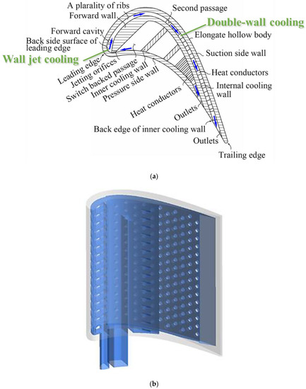 Unlike the radial internal cooling schemes, a design allowing coolant air to flow along the blade profile to avoid Crossflow was put forward by Zhang et al. [30] in 2017, named multi-channel wall cooling. As shown in Figure 1, the design is the combination of wall jet cooling and double-wall cooling, which are the leading-edge part and suction side part separately. The wall jet cooling chamber is separated by the ribs connecting the outer wall and inner wall into several parallel rectangular channels. After impinging the inner stagnation line, the wall jet flows along the target surface under the action of centrifugal force. Under the same flow mechanism with swirl cooling, the attaching-wall jet generates Görtler vortex pairs on the curvature’s surface, enhancing the target surface’s heat transfer. The spent coolant is extracted through the passage of the double-wall cooling to the exit at the trailing edge instead of mixed with the fresh jets. It was proposed based on the fugitive core casting technology, which could manufacture complicated structures by inserting tiny fugitive cores into ceramic cores and is a proven technology. Therefore, the multi-channel wall cooling design has great cooling air utilization and higher heat transfer enhancement with less manufacturing cost [30]. As the critical component, wall jet cooling maximizes the heat transfer performance of impingement cooling and is simple enough to be accommodated in blade leading edge.