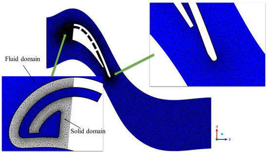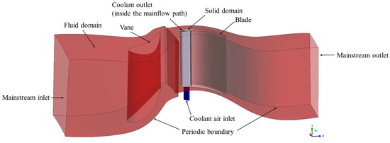 The commercial CFD software ANSYS CFX was utilized to solve the steady-state compressible Reynolds averaged Navier–Stokes (RANS) equations. The method is widely used for conjugate heat transfer (CHT) modeling and has enough prediction accuracy in the design of turbine blade cooling [34]. It is notable that the unsteady conjugate heat transfer simulation is very difficult at present because the time scale of solid conduction is about 10,000 times larger than that of fluid convection [35], so the unsteady calculation could not be carried out. The maximum iterations number was 1000, and the second-order accuracy was used with max RMS residual less than 0.0001.