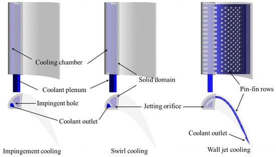 As shown in Figure 2, the simplified model of the first stage of GE-E3 turbine was simulated to conduct the study. The fluid domain contains the mainstream path (marked in red) and the internal cooling chambers at the leading edge of the blade (marked in blue), and the two regions are connected at the coolant outlet. In the passage with pin-fin rows in Figure 3, the solid domain is only the leading-edge part of the blade (marked in dark gray) to avoid the additional heat transfer of double-wall cooling. In other words, the region marked in light gray is not simulated. The periodic boundary condition was utilized in the study to reduce computational cost. Figure 3 illustrates the internal cooling structures investigated in the study, including the impingement cooling with a single row of jet (IC), swirl cooling (SC), and wall jet cooling (WJ). For the blades with impingement cooling and swirl cooling, the coolant and cooling chambers were designed based on the original design of GE-E3 turbine [33]. The film holes were ignored and the coolant outlet was at the tip clearance according to engineering practice, the height of which is 0.4 mm and 1% of the blade height.
