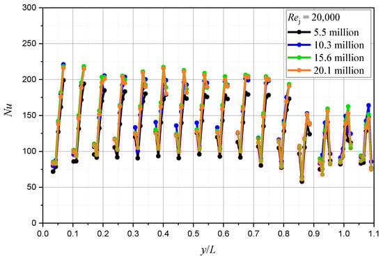 In Figure 6, y is the height direction coordinate and L is the chord length of the blade (35.21 mm). Due to the target surface of the wall jet cooling structure is divided by the ribs connecting the double walls into several pieces, the curves are discontinuous. It can be seen that the curves have the same tendency, and the results with a size over 10.3 million are nearly coincident. The maximum relative deviation between the results of 15.6 million and 20.1 million grids is 5.89%, which is at the penultimate peak. Therefore, a setting of the 15.6 million grids was selected to generate fluid domain grids. The solid domain grids’ testing results are all coincident with the maximum relative deviation of 0.94%. The results are ignored to avoid duplication of the curves. The girds of 3.5 million was selected as the solid domain for reducing the computational cost.