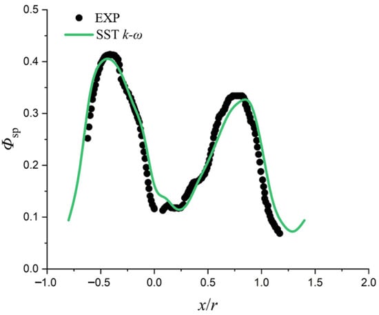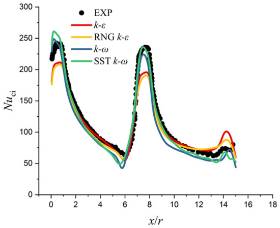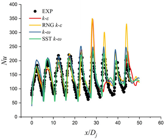 The k-ε model, RNG k-ε model, k-ω model and SST k-ω model are adopted in the turbulence model validations, and the results are demonstrated in Figure 7, Figure 8 and Figure 9. In Figure 7, the experimental configuration was the plate jet impingement based on the geometry measured by Xing et al. [36]. From the comparison of numerical results and experimental data on the plate centerline, it can be concluded that SST k-ω model has the best prediction accuracy among the four broadly used models in simulating the heat transfer characteristics of impingement cooling under the Crossflow effect. In Figure 8, the swirl tube with two tangential inlets and a single outlet was firstly proposed and investigated by Ligrani et al. [37], and the heat transfer coefficient distribution and flow field of the structure was studied by Ling et al. [38]. In the paper, the experimental data in Ref. [38] was adopted to validate the turbulence model. In Figure 8, the x and r are the stream-wise distance and the pipe radius. The comparison of numerical results and experimental data also shows that the SST k-ω model is the optimal choice for simulating swirl cooling. To the author’s knowledge, there are little experimental data about wall jet cooling, and the flow structure of wall jet is the combination of the impingement jet and swirl jet. Therefore, we hold the opinion that the SST k-ω model is qualified for the prediction of wall jet cooling.
