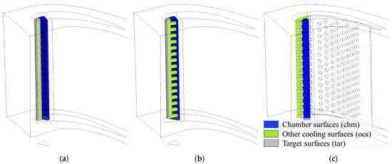 Although the preceding area-averaged parameters exhibit the heat transfer intensity in different structures, the overall cooling effectiveness also depends on the area of internal cooling surfaces. Based on positions, the surfaces are classified into target surfaces (tar), chamber surfaces (chm) and other cooling surfaces (ocs), which are shown in Figure 10. The target surfaces are the inner surfaces of the blade outer wall at the cooling chamber region, directly impacting the leading edge’s cooling performance and marked in gray with 20% transparency. The chamber surfaces are the coolant supply chamber’s inner surfaces in the blade and marked in blue. The other cooling surfaces include the jet holes or orifices surfaces and the cooling chamber surfaces except for the target surfaces marked in cyan.
