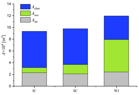 The internal cooling area comparisons among different internal cooling structures are illustrated in Figure 11. It can be seen that the target surfaces of the three structures almost have the same area, although those of wall jet cooling are discrete and parallel. For every single cooling channel of WJ, merely the outer surface is classified as the target surface; the other surfaces are all ‘other cooling surfaces’; hence, the ‘ocs’ of WJ has 6.4 times IC area and 3.5 times SC area. Regarding the chamber surfaces, the WJ area is nearly 67% of that of IC or SC. The reason is that the double-wall design of the wall jet cooling structure limits the size of the coolant supply chamber.