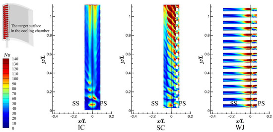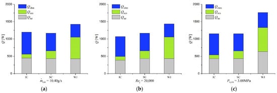 The total heat flux among different internal cooling structures is demonstrated in Figure 12 to contrast the cooling performance of the three designs and quantify the contributions of different surfaces. It is apparent that the heat flux of every part is directly proportional to its area for all the structures. Although the flow mechanism in the cooling chamber varies from that of cooling structures, the heat fluxes on the three structures’ target surfaces are nearly the same as the jetting Reynolds number of 20,000. The smallest area of the coolant chamber surface of wall jet cooling results in its lowest Qchm among all the cooling methods. However, the ‘ocs’ area’s huge preponderance ensures that WJ has the largest total heat flux compared with IC and SC, no matter under which coolant inlet boundary condition. Besides, WJ’s total heat flux in Figure 12c only increased 12% relative to that in Figure 12b, with a 154% gain in coolant mass flow rate. It means that the jetting Reynolds number of 20,000 might be close to an optimal value for WJ’s current design, and the Rej over 20,000 would lead to unnecessary flow resistance. If more coolant is needed to dissipate the suction side wall’s heat load in a real WJ design, the jetting orifice width should be increased to reduce the pressure loss.