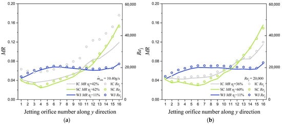 Figure 13 depicts the two above parameters’ distributions and jetting Reynolds number under all the coolant inlet boundary conditions studied in this paper. It is evident that the jet mass flow rate rises with the blade height for all the cases, and the curves seem to be dominated by geometrical structures but not coolant boundary conditions. Besides, wall jet cooling has the most homogeneous coolant distribution in jetting orifices. Relative to the MR distributions of impingement cooling and swirl cooling, the curves of WJ are much more moderate from jetting hole 1 to jetting hole 16. The mass flow nonuniformity coefficients of wall jet cooling is 11–14%, which is nearly 30% and 50% lower than that of impingement cooling and swirl cooling structures. Additionally, the jetting Reynolds number distribution is generally in parallel with the curves of MR; however, the values of Rej would increase dramatically with coolant mass flow.
