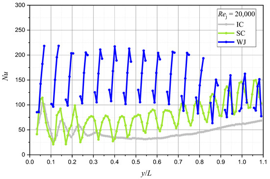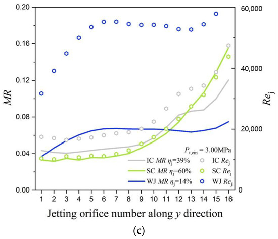 Table 4 depicts the parameters of the cases with the same jetting Reynolds number. The main difference between Table 3 and Table 4 is the values of IC. With Rej = 20,000, the coolant mass flow of IC is lower than that of SC and WJ, and the cooling performance of IC is also the worst.