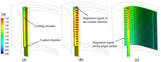 Figure 14 illustrates the pressure ratio (PR) distribution of different internal cooling structures. Equation (6) gives the definition: