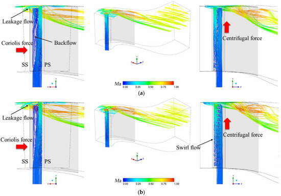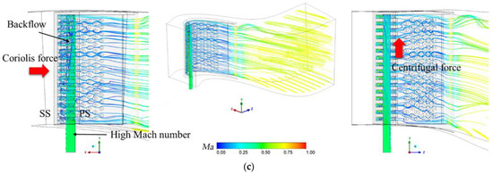 Figure 15 shows the internal streamlines of the three cooling structures viewed from three angles with the jetting Reynolds number of 20,000. In Figure 15a,b, it can be seen that the air in the coolant chamber is pushed to the pressure side by the Coriolis force, and the effect is more obvious with the height increases in the three structures. The radial velocity difference leads to the backflow in the coolant chamber, which would weaken the cooling of the suction side. The centrifugal force influences both the backflow and the swirl flow in the cooling chamber. Besides, the tip leakage flow produces additional cooling near the tip of the blade, which is not a designed function of the internal cooling structure. In Figure 15c, the Mach number inside the WJ is higher than 0.3. This is mainly because the cooling channels and inner wall limit the cross-section area of the coolant chamber. With a small coolant chamber, the flow in it is compressed and also pushed by the Coriolis force to attach to the pressure side of the blade inner surface. When the coolant’s mass flow rate is large, the pressure loss will increase dramatically, and the orifice should be wider.
