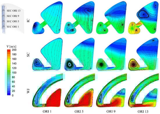 Figure 16 demonstrates the streamlines and velocity contours on the sections at the middle height positions of orifices 1, 5, 9 and 13. The impinging jet inside IC forms a double swirl structure in the limited space of the cooling chamber, which helps to enhance the heat transfer on the pressure side and the suction side. However, the momentum exchange between the high- and low-velocity fluids would weaken the kinetic energy of the jet flow, which might reduce its resistance to the Crossflow in the cooling chamber and further deviate the jet from the stagnation line at the inner surface. In the SC structure, the jet flow attaches to the inner wall surface of the pressure side from the coolant chamber and forms an obvious swirling flow in the cooling chamber. With high turbulence, the swirl flow would break the boundary layer on the inner surface and enhance the cooling performance. For the WJ structure, the coolant with high radial velocity flows near orifice 1, so the jet in it would impinge the top surface of the orifice under the effect of inertial force, and the jet velocity in the middle height section of orifice 1 is low. As the radial height increases, the mass flow rate in the coolant chamber decreases, so the angle between the jet and the orifice direction decreases, maintaining a higher momentum for impinging the target surface. Under the effect of Coriolis force, the jet of WJ is always attached to the pressure side. There is an obvious separation vortex at the exit of the orifice. The sheer force of the attaching-wall jet would strengthen this separation vortex, further enhancing the heat transfer intensity at the leading edge region. This flow characteristic is the same in channels of different heights.