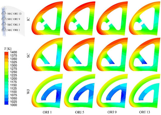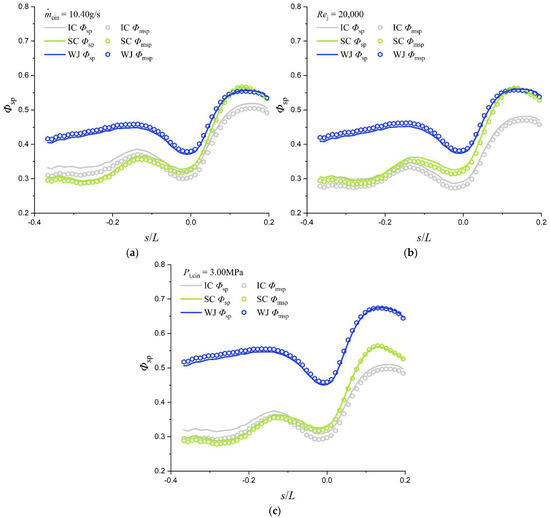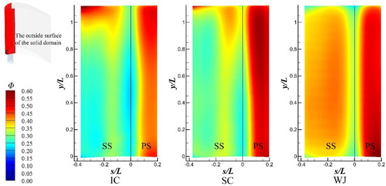 In this section, the overall cooling effectiveness, blade temperature distribution, and internal heat transfer coefficient of IC, SC, and WJ are compared to study the heat transfer characteristics in detail. Figure 17 shows this span-wise averaged overall cooling effectiveness around the blade leading edge with three cooling structures. Since the tip leakage flows of IC and SC structures would provide additional cooling to the blade, the figure shows the average values of overall cooling effectiveness for two lateral ranges. The ‘sp’ represents the lateral average of the full blade height range, and the ‘msp’ represents the lateral average of the ‘main region’, which is 20–80% of the blade height. It can be found that the leakage flow mainly affects the downstream of the suction side and has little effect on WJ. The lateral average overall cooling effectiveness distribution trends of the three structures are similar. The Φsp on the suction side is low, on the pressure side is high, and there is a peak on each side. The WJ has significant advantages near the leading edge stagnation line and on the suction side. With the same jetting Reynolds number, the Φmsp value of WJ is 37.3% and 18.8% higher than that of IC and SC at the leading edge stagnation line, respectively, and 37–59% and 19–54% higher on the suction side, respectively. With the same total pressure at the coolant inlet, the Φmsp value of WJ is 54.5% and 41.4% higher than IC and SC at the stagnation line, respectively, and 30–80% and 20–90% higher, respectively, at the whole leading edge.