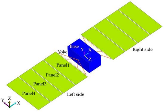 Firstly, a satellite system composed of base, yoke and solar panels was modelled as rigid bodies, as shown in Figure 1. According to the LAPAN-constellation satellite [32], the mass properties of base, yoke and solar panels are listed in Table 1.