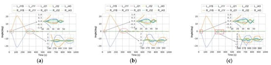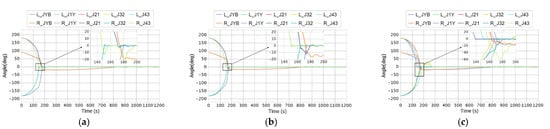 Rotation angles of TSHs in orbit maneuver: (a) by rigid body; (b) by MORM; (c) by FEM.