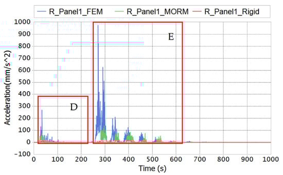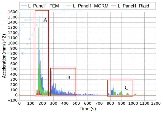 The acceleration of the middle point of panel edge was measured to investigate the vibration condition of panels. The acceleration of the rigid body model was much smaller than either the MORM model or the FEM model. Because the rotation angles of TSHs turned to 0° in Section A, the vibration condition of the MORM model was similar to that of the FEM model, as shown in Figure 9. Because the rotation angles of R_J43 and L_J32 were larger than 4° during 220~260 s in the FEM model, as shown in Figure 8c, the R_J43, L_J43 and L_J32 had slight effect on the vibration of Panel 1. As these TSHs affected Panel 1 in the MORM model, the vibration of the Panel 1 continued to 300 s. Because the R_J43 and L_J32 of FEM model turned to 0° at about 280 s, the lock-up torques regenerated accelerations in the Panel 1, as shown in the Section B of Figure 9. Section C illustrates the R_JYB and L_JYB of the FEM were deployed earlier than that of the MORM. The local deformation of panels consumed the kinetic energy of the panels, additionally, the local deformation also kept the TSH within a high stiffness range, so the panels of FEM came into a stabilization condition earlier than those of MORM model.