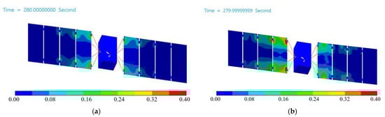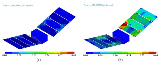 The stress contours of MORM model and FEM model at 280 s are shown in Figure 10. Generally, the Von Mises stress of the panels was less than 7.0 MPa which is much lower than the allowable stress. Because the R_J43 and L_J32 impacted with the stabilized panels in the FEM model, the local stress near the TSHs was larger by FEM than that by MORM. Although all the panels were deployed successfully here, the coupling effect between the nonlinear stiffness of TSHs and nonlinear deformation of panels affected the sequence of deployment and overshoot conditions. Therefore, the coupling effect should be considered in precise control of the attitude of the deployment and development of TSHs. Additionally, the MORM was much efficient than FEM, and the calculation times of deployment simulation by MORM and FEM were 192 min and 1672 min, respectively.