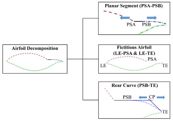 In this study, the sectional airfoil profiles are quite different from that of the conventional airfoils because of the existence of the specified planar segment. It is necessary to develop a geometry parametric method that can meet current needs. As shown in Figure 4, the sectional airfoil is decomposed into three parts and parameterized in a separated way.
